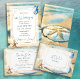 Elegant romantic oceanic coastal themed wedding stickers. Soft pastel brown sand pale blue water with a sand dollar on the beach.
