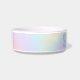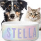 Trendy pet bowl featuring a soft pastel rainbow pattern background and your pet's name in light purple.