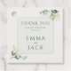 This romantic wedding favour tag features delicate blush pink watercolor flowers complemented by soft green leaves, elegantly framing the happy newly married couple’s names. Set within a timeless botanical frame, the design blends rustic elegance with vintage refinement, capturing the warm, heartfelt gratitude of an autumn wedding momento. The soft pastel tones of pink and green create a gentle, romantic ambiance that is perfect for garden party table decor. Including the wedding date, this charming tag adds a graceful, personal touch to favours or gift bags expressing thanks and appreciation to family and friends in a beautifully understated way. It’s an ideal detail to enhance the natural beauty and heartfelt sentiment of your special day.
