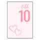 This wedding table card features a minimalist design with a soft pink background, creating an elegant and inviting atmosphere. The layout includes the word "table" in cursive script above bold numerals "10," both in matching light pink hues, ensuring clarity and prominence. Two delicate outlined hearts add a romantic touch to the bottom left corner, enhancing the gentle mood of the design. Perfect for weddings or formal events, this card combines simplicity with charm, making it ideal for setting a warm and welcoming tone at your celebration.