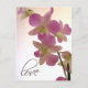 Soft purple orchids against a cream background with love in script font. Perfect postcard for wedding showers, save the date, engagement announcements and more.