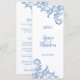 © 2018 Socialite Designs Inc. Beautiful corner swirls and flourishes, hand-painted in soft royal blue watercolor, menu cards that complement the matching wedding collection.