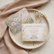 This airy invitation was inspired by a quiet spring morning in a field of blooming wildflowers. Gentle watercolor blossoms, soft pastel tones, and elegant script create a light, romantic look—perfect for celebrating a little wildflower on the way in a fresh garden-inspired setting.