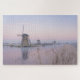 Jigsaw puzzle of a winter landscape with old windmills in the soft pastel light of a sunrise with ice on the river and frost on the reeds on a cold morning in Kinderdyke, the Netherlands.