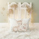 A dreamy and elegant accent pillow perfect for a girl's nursery, bedroom, or cozy living space. This design features original soft watercolor artwork of a gentle baby deer (fawn) and a sweet little bunny, both adorned with subtle tiny crowns or light bows. The scene captures a peaceful, warm winter setting with delicate falling snow, subtle winter foliage (berries and soft leaves), and sparkling soft gold star accents. The palette is a refined "Girls MerryMist Palette," highlighting Blush