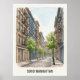 SoHo watercolor neighbourhood artwork featuring iconic cast-iron buildings, tall arched windows, fire escapes, and cobblestone streets rendered in soft washes of muted greys, warm stone tones, and subtle industrial blues. The composition highlights SoHo’s artistic, stylish, and historic character, emphasizing its unique architecture and creative energy without including people or storefront branding.
