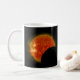 The dark shadow of the moon crosses in front of the sun during a solar eclipse captured in space and enhanced in this image.