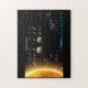 A jigsw of the Solar System showing all planets and dwarf planets to scale and in the correct order from the Sun. Includes the Size, Mass and Orbital Period of each object. Also has a scale graphic showing the orbital distance of each object from the Sun. Background Graphic NASA/JPL.
