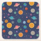 A fun and modern solar system pattern with colourful planet, star and sun illustrations against a dark blue background.
