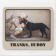 This touching photo shows a soldier in combat fatiques thanking his companion dog with a kiss on the head, in a rounded corner frame. Photo caption "Thanks Buddy" is written in black classic stencil military font. The text is completely changeable if you want to customise or remove it. Perfect gift to show support and appreciation to the military for the job they do.