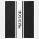 This design has a solid black background colour with white stripes and a modern font. Customise the name using the template field.