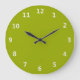 Pretty kitchen wall clock of a bright green known as limeade. Twelve white numbers on a plain blue background. Perfect addition for a kitchen with a green colour scheme
