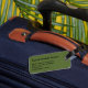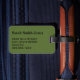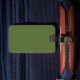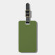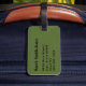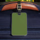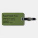 Luggage tag with name and address on a solid olive green background colour. Personalise with your name and address information using the easy templates. Font colour, font style, and font size are customisable.