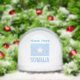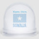 Snow globe featuring the Somali flag with the word SOMALIA below in the colours of the flag and with a white, blue-bordered star in the centre. The letters are made to look as though they were cut from stone with a darker blue border than the light blue of the flag. The Somali flag itself is a white star on a light blue background. Personalise by placing your name in the space provided. Or, create a gift by adding someone else's name instead. Makes a thoughtful holiday gift for those of Somali ancestry. Cool stocking stuffer.