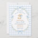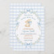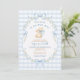 Featuring soft blue gingham checks, a watercolor bunny holding a baby bottle, and a bow-and-floral wreath framing your event details, this design blends classic nursery style with gentle whimsy.