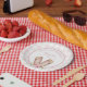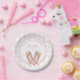 Some Bunny is turning one Birthday girl's party paper plates. Lovely typography in pastel pink. Adorable watercolor bunny ears with pink wildflowers on a pastel pink gingham background. Easy personalise your special Birthday girl's name.