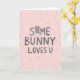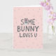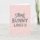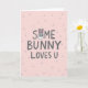 This design shows a pastel pink background with big, rounded sans-serif letters in white that read “SOME BUNNY LOVES U,” giving the message a sweet, friendly tone 🐰. The words are centred and take up most of the space, with the phrase stacked so it feels close and cosy, like a note meant for someone special. In the word “SOME,” the “O” is replaced by a simple rabbit face, as if the bunny is peeking into the message with a gentle, affectionate look. The rabbit is drawn with a round white face, tiny black dot eyes, a small nose, faint whiskers, and tall ears with soft pink inner details 🐇. Around the lettering, small pale grey five-pointed stars are scattered loosely, adding a light, dreamy touch without stealing attention from the words. The limited palette of blush pink, soft grey, and crisp white keeps everything calm and tender, like a quiet moment shared between close friends. The phrase “SOME BUNNY LOVES U” sits in the middle, while the pale grey stars float across the pink field like tiny confetti.