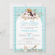 This adorable 'some bunny special is on the way' themed baby shower invitation features a cute hand-painted bunny wearing a straw hat, nestled among delicate wildflowers and greenery on a soft blue gingham background. The whimsical country theme is beautifully complemented by elegant script and clean modern typography in blue and charcoal grey. Perfect for a spring or rustic-inspired baby shower, this sweet and stylish design sets a joyful tone for honouring the parent/s-to-be. This bunny-themed invitation blends rustic charm with a soft pastel aesthetic to create an unforgettable first impression for your baby shower event. Available as printed cards or an instant digital download.