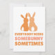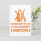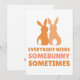Send some Easter cheer with this charming card featuring two bunny silhouettes and the heartfelt phrase, "Everybody Needs Some Bunny Sometimes," in warm brown hues. Perfect for friends, family, or loved ones who could use a little extra love this season. Whether it's for Easter, springtime wishes, or just a cute note, this card is a delightful way to spread some bunny love!