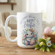 This sweet Easter mug features cuteness overload with a darling little white bunny rabbit holding a painted Easter egg while nestled among a bouquet of pastel coloured floral greenery. The text above declares "Some Bunny Wishes You A Happy Easter" in an adorable pastel violet decorative script.