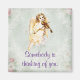 A magnet with a sweet image of an angel playing the violin with flowers in her hair. This vintage image looks weathered and faded from the hands of time, and has an worn yellowish tone. The background is a delicate texture in grayish white vintage style paper. The text says "somebody is thinking of you." in a fancy purple font.