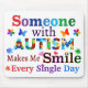 Inspirational Autism quote of “Someone With AUTISM Makes Me SMILE Every Single Day” with colourful Autism puzzles, beautiful flowers, and butterflies to support autistic children and their families.