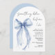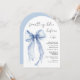 Chic arch-shaped bridal shower invitation featuring a light blue coquette bow watercolor, "something blu before I do" in a modern calligraphy script, and the bride's name name and shower details in simple lettering.