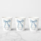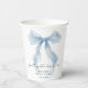 Elegant paper cups for your bridal shower featuring a watercolor of a whimsical blue bow, "something blue before I do" in a chic calligraphy script, and the bride's name and the shower date in classic serif typography.