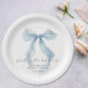 Elegant paper plates for her bridal shower featuring a vintage blue coquette bow watercolor, "something blue before I do" in a chic calligraphy script, and the bride's name and the shower date in classic serif typography.