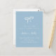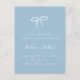 Simple and sweet, this "something blue" bridal shower invitation features handwriting style fonts and a delicate bow graphic to celebrate the bride to be in on-trend and modern style. The budget-friendly postcard format makes hosting easier on the wallet when weddings can end up costing so much for bridesmaids and family members.