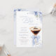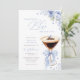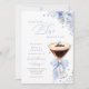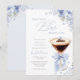 An elegant bridal shower invitation featuring a chic espresso martini illustration with soft blue florals and a delicate bow accent.