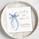 Elegant bridal shower napkins featuring a beautiful watercolor of a light blue coquette bow, "something blue before I do" in a chic calligraphy script, and the bride's name and shower date in simple modern lettering.