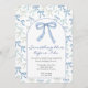 This invitation features a pattern of blue watercolor painted ribbon bows for a "something blue before I do" themed bridal shower.