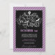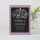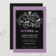 Intricate lettering proclaims, "Something WICKED this way COMES" on this original design by Kat Parrella. White typography and black on purple styling -accented with a diagonal tuxedo stripe background. Elegant, spooky and fun - an invitation they are sure to love.