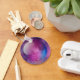Against a backdrop of royal blue and intricate hot pink clouds like distant galaxies is a single smooth glass orb with a swirling fractal suspended inside.