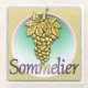 The original illustration by ZoeSPEAK on this Glass Coaster features a golden bunch of grapes. A gold pin like this is worn by a sommelier. A sommelier, or wine steward, is a trained and knowledgeable wine professional who specialises in all aspects of wine service as well as wine and food pairing. In this illustration, the grapes light up the deep purple letters "sommelier", like sunshine in the vineyards. A round green shape echoes the wine bottle and the greens and deep reds of the vineyard. A cork textured background surrounds the scene.