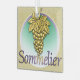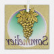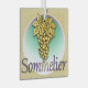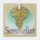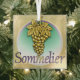 The original illustration by ZoeSPEAK on this Glass Ornament features a golden bunch of grapes. A gold pin like this is worn by a sommelier. A sommelier, or wine steward, is a trained and knowledgeable wine professional who specialises in all aspects of wine service as well as wine and food pairing. In this illustration, the grapes light up the deep purple letters "sommelier", like sunshine in the vineyards. A round green shape echoes the wine bottle and the greens and deep reds of the vineyard. A cork textured background surrounds the scene.
