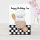Certainly! A whimsical and endearing Son Birthday card featuring a delightful gnome baker. The front of the card showcases an adorable gnome donning a charming baker's hat, immersed in the joy of baking. With a wooden spoon in hand, the gnome exudes a playful and mischievous expression, radiating a sense of warmth and happiness. The gnome is set against a stylish black background adorned with chequered patterns, creating a visually striking contrast and adding a touch of sophistication to the design.