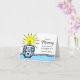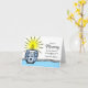 Jewish Anniversary of Death for someone's son. A Yahrzeit candle is inside a light blue glass jar and has been lit for someone's brother. May his memory be for a blessing, text on the cover. White, black, yellow, and blue colour scheme. A curving line design and a Star of David are on the candle holder. Add a name to the cover for a customised greeting card. Art, image, and verse copyright © Shoaff Ballanger Studios, 2024.