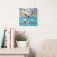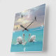 Featured is a white swan family with flying swans in a pretty seaside setting.