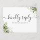 An elegant greenery leaves black and white signature script RSVP card with chic typography. The reverse features your details and a fun guest song request. Designed by Thisisnotme©