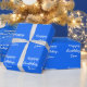 White lettering is featured on a blue background on this birthday, gift wrap for a son.