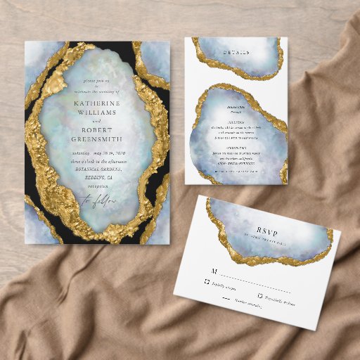 Our "Agate Pearl Gold Wedding" collection features vivid pearl illustrations with a faux golden foil border for a super elegant wedding invitation suite. Paired with modern fonts and two colour schemes it is suitable for year round wedding celebrations. Check our store for more items from this collection.