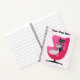 This spiral notebook has two sophisticated atomic cats wearing diamond collars, one black the other white sitting in a mid century pink chair on a white background with pink dots. Customise your text on the front with the template.