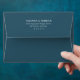 This elegant wedding envelope features a clean, minimalist design with centered text on a deep navy background. The crisp white serif font creates a sophisticated and formal look, perfect for conveying important details. Its simple layout emphasizes clarity and balance, making it ideal for weddings or formal events. The absence of additional graphics keeps the focus on the timeless typography, ensuring a polished and professional appearance.