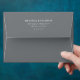 This wedding envelope features a sleek, minimalist design with a solid gray background and crisp white text. The layout is centered and symmetrical, emphasizing clarity and elegance through clean lines and precise spacing. Utilizing modern sans-serif typography, the design focuses on functionality with customizable placeholders for names and addresses, making it perfect for formal announcements. Its understated style conveys sophistication, ideal for couples seeking a refined and contemporary look for their special day.