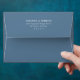 This wedding envelope features a sleek, modern design with a solid blue background and crisp white text. The layout is centred and balanced, showcasing the names and address in a clean, sans-serif font that emphasizes clarity and elegance. Its minimalist style exudes sophistication, making it perfect for formal invitations or special occasions where simplicity meets class. The absence of decorative elements ensures the focus remains on the essential details, ideal for couples seeking a timeless and professional look.