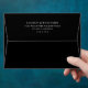 This elegant wedding envelope features a minimalist design with a clean, modern aesthetic. The layout is centered on a black background, showcasing crisp white text in a sans-serif font that conveys sophistication and clarity. With ample negative space around the text, it emphasizes the names, address, location, and zip code, making it perfect for formal invitations. The straightforward typography and monochromatic color palette create a timeless look ideal for any special occasion.