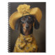 Elegant chic Dachshund in the style of the Dutch painter Frans Hals. Cute dog wearing a yellow dress and hat with yellow flowers