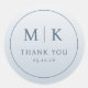 This wedding sticker features a minimalist circular design with a soft grey-blue colour palette, creating an elegant and modern aesthetic. The layout includes bold serif initials "M" and "K," separated by a vertical line, followed by the phrase "THANK YOU" in smaller, matching font, all centred for symmetry. The clean composition emphasizes simplicity and sophistication, making it perfect for expressing gratitude at weddings or other special occasions. Its understated style conveys a timeless appeal, ideal for those who appreciate refined and contemporary designs.